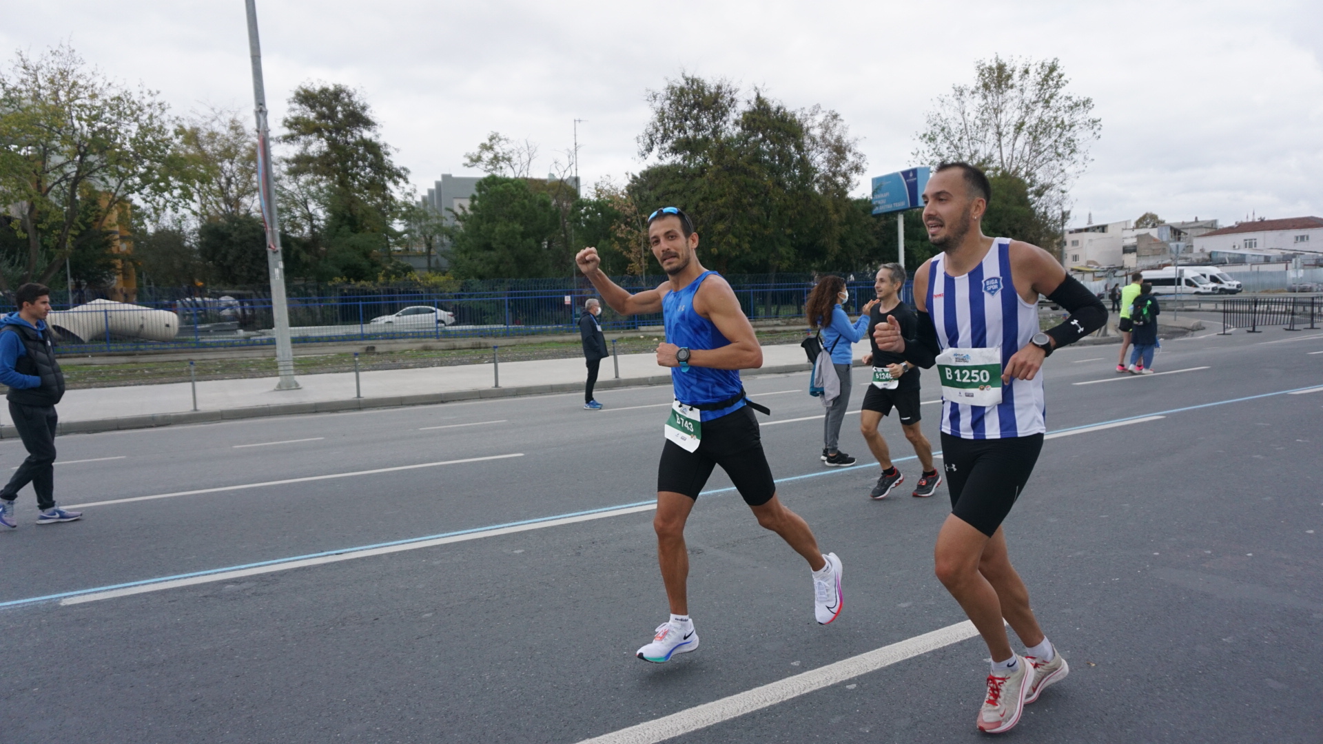 İnönü Stadı, Karaköy, Galata Köprüsü derken destek çok güzeldi gerçekten. Hiç yalnızlık çekmedik. Galata Köprüsünde yine fotoğraflarımızı verdik ancak köprü bitişinde artık 30.km ye gelmiş ve yorgunluk yavaştan hissettirmeye başlamıştı. Ama hedef süremizin sadece 1dk gersinde geliyorduk. O da saatte 200m sapma olduğu için olan bir farktı. Tam Eminönünde yine Tarık, Gökçe, Serhan abi, Dilek ablayı gördük. Destekleri yorgunluğumuzu aldı ve Balat'a doğru devam ettik. Yol üzerinde koşu grupları cheer pointler kurmuştu. Burada da yalnız kalmadık. Balat da Murat karşıladı bizi. Yorgunluk artık baş göstermişti. fazla konuşmamaya, kalan enerjimizi doğru kullanmaya gayret ettik.  Balat'ı döndükten sonra artık son 8 km ye girmiştik. Burdan sonrası tamamen mental.